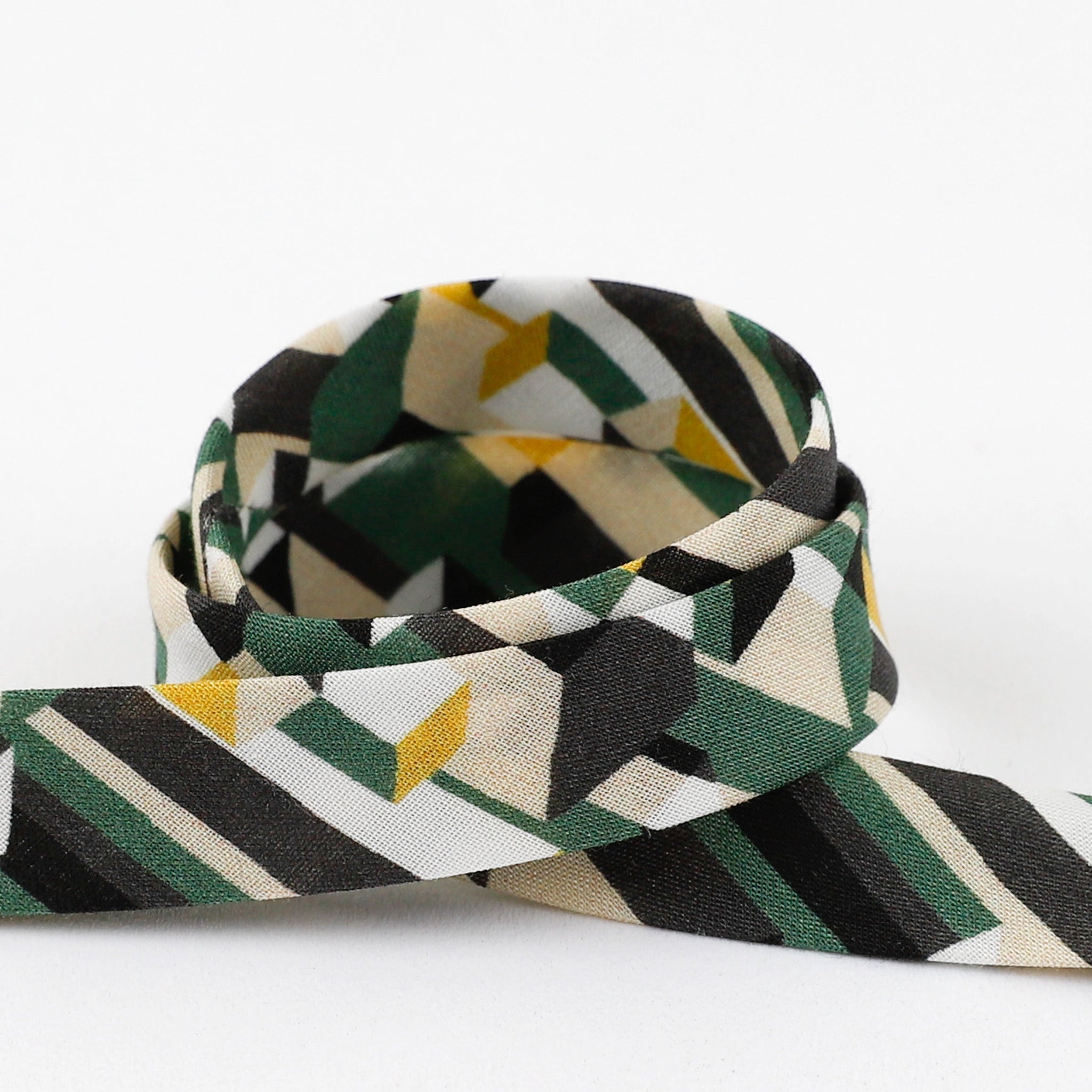 Liberty Of London bias binding featuring a Liberty Tana Lawn - Metropolis in a green colourway. Our bias binding is a double-fold tape with a finished measurement of 1cm (3/8"), making it super straightforward to attach. Use as contrasting feature on necklines, ruffle edges and pockets or have as a special hidden detail on inside seams and a for bias-faced hems, creating a unique finish to your garments.