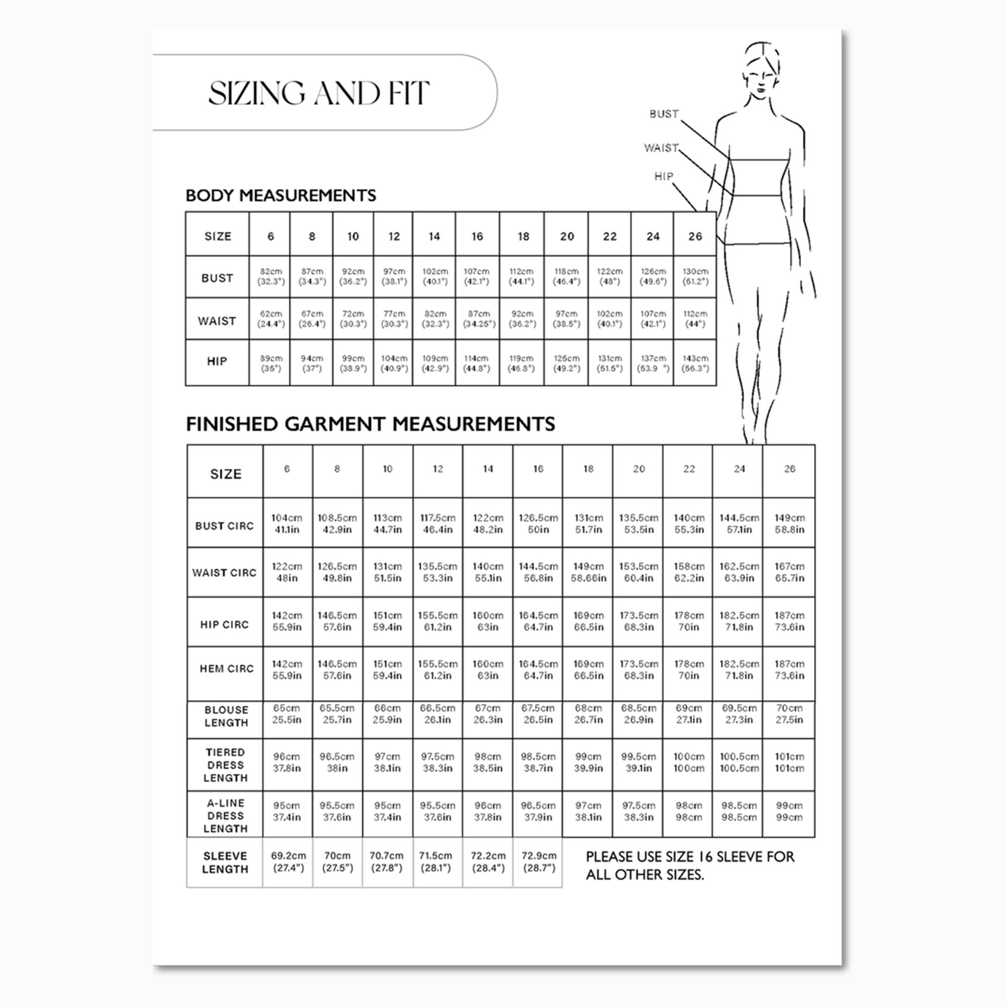 The Freya is a statement piece, whether you choose to create a blouse or a dress – or both! The pattern features an elasticised, tri-section puff sleeve with three length options. The bodice has a keyhole back opening with a tie. The pattern comes in sizes 6-26 and is suitable for beginner sewers. Requires 1-1.5cm wide elastic. The Freya pattern can be made in a variety of fabrics. The designer suggests a beautiful linen.