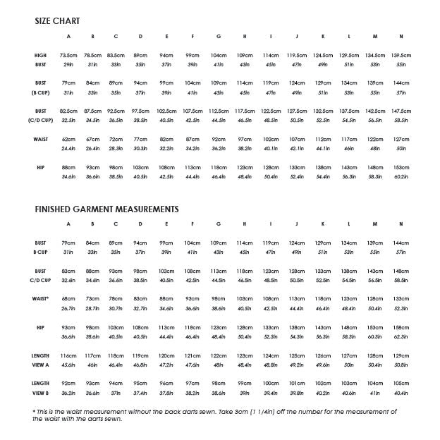 optional darts for extra shaping. The pattern cut on the bias allows the dress to gently mold to the body.Available in sizes A to N, with a B cup and C/D cup option.