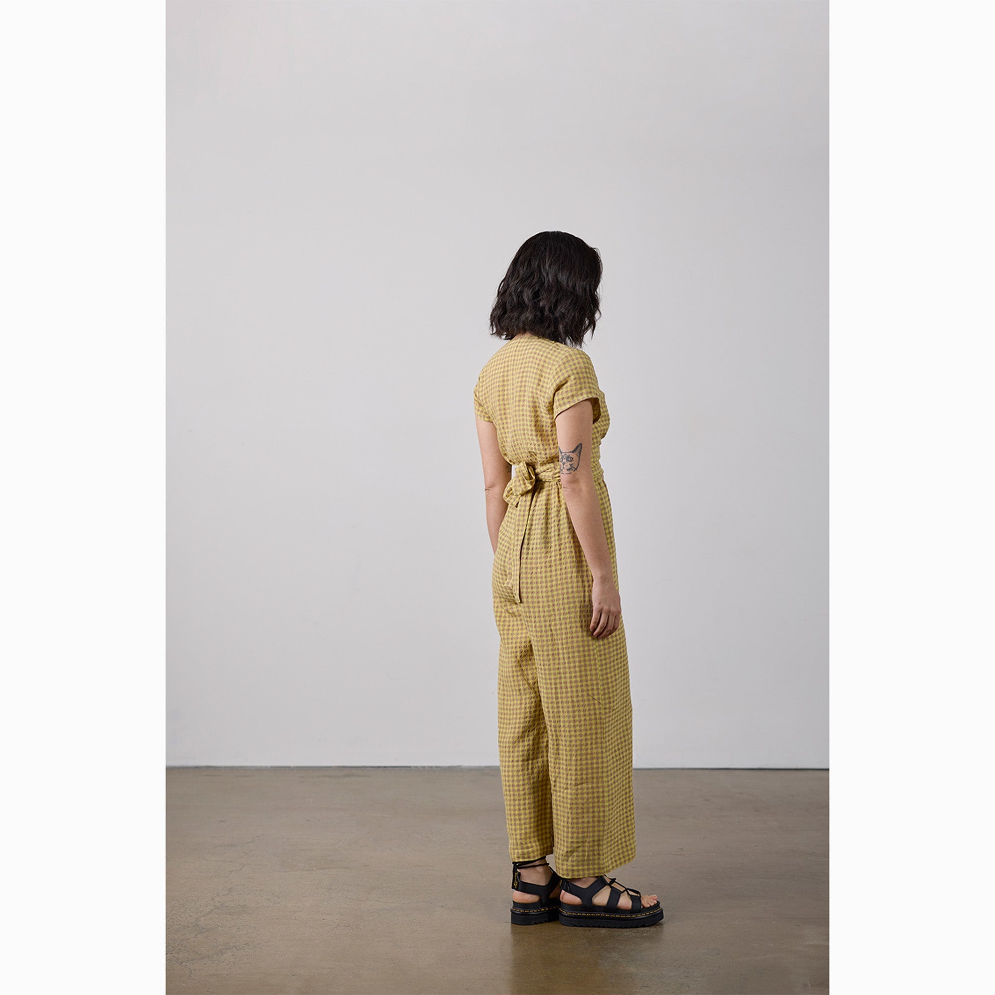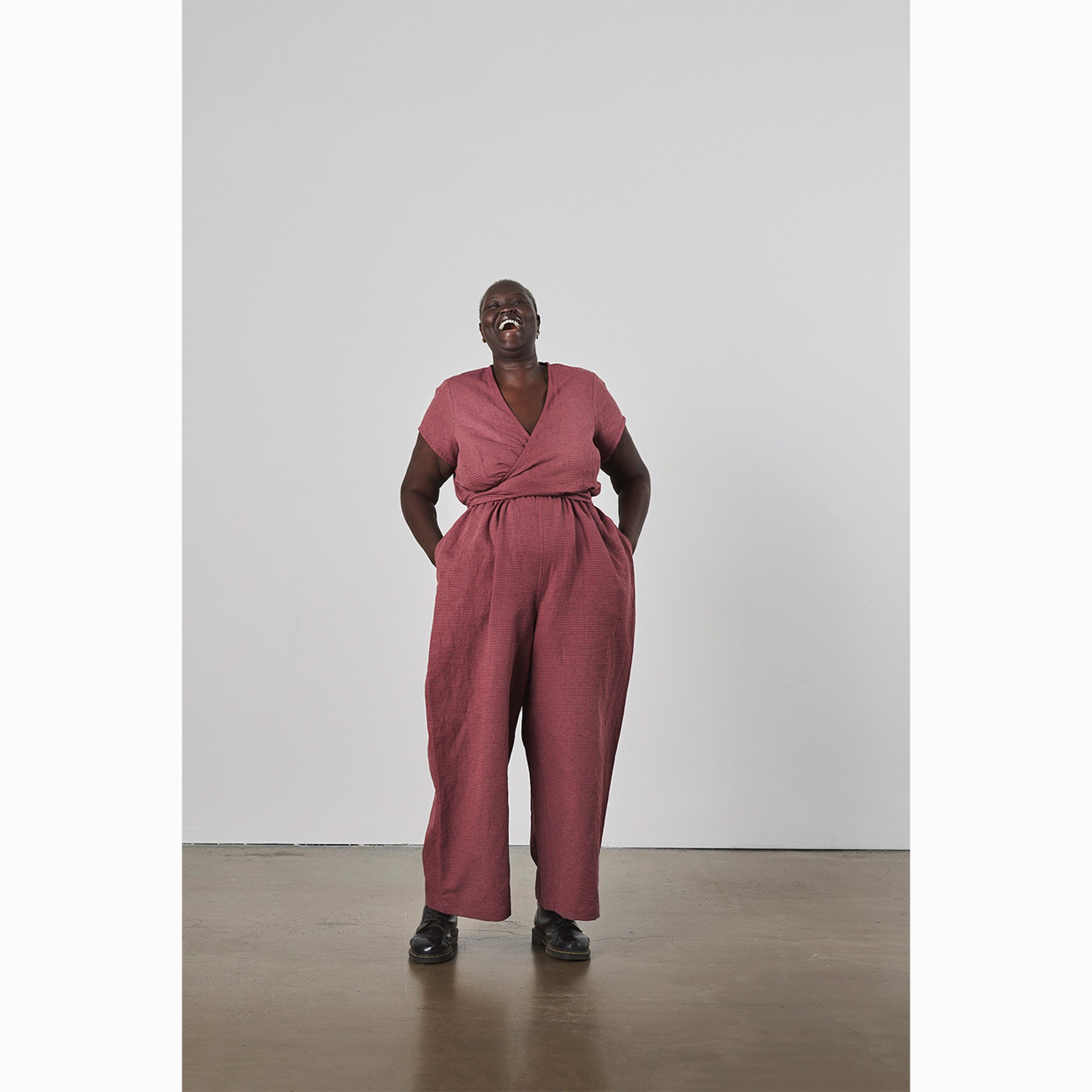 The wide leg jumpsuit comes with inseam pockets and finishes at the ankle, while the dress has an A Line skirt finishing below the knee. Suitable for intermediate sewers and above.
